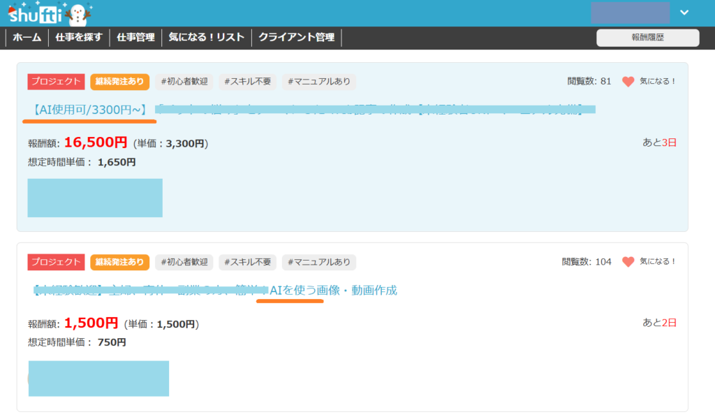 こんな感じに案件名にAI使用と入る案件が見受けられます。